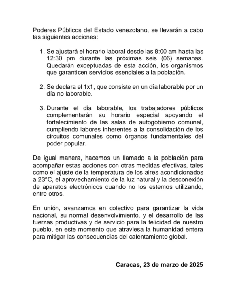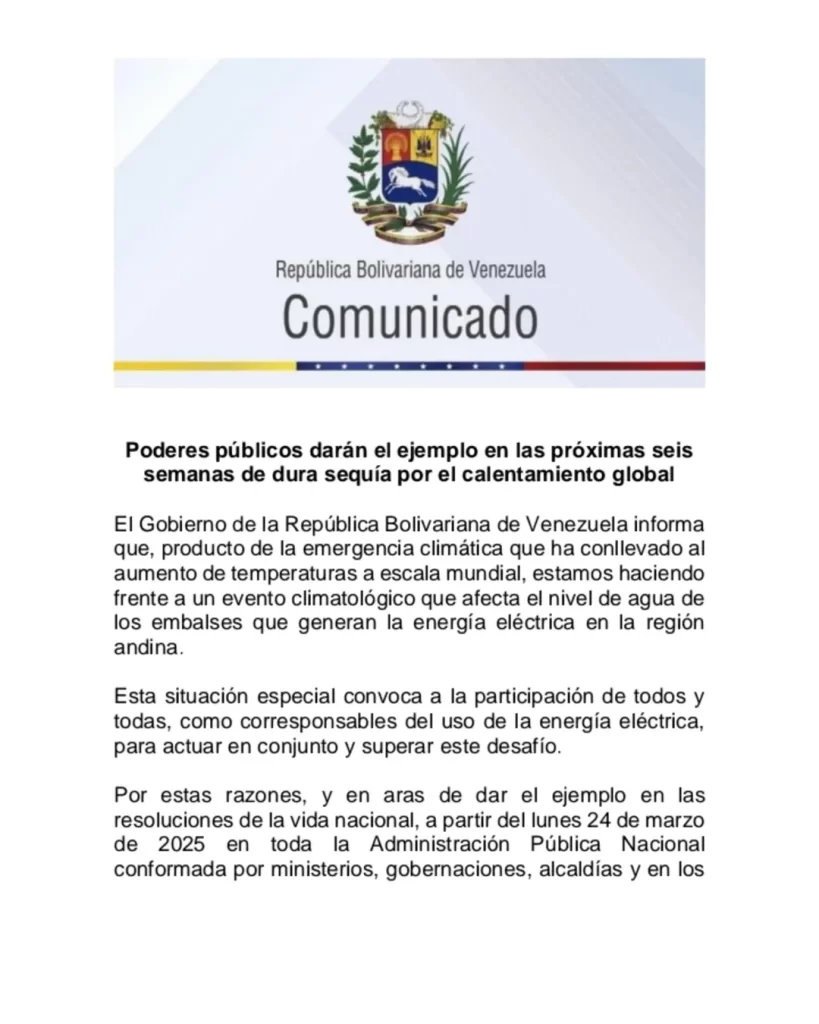 Ante la #emergencia climática que ha ocasionado el aumento de #temperaturas a escala mundial, el Gobierno de la República Bolivariana de Venezuela anuncia una serie de acciones a ser aplicadas por la Administración Pública Nacional a partir de este lunes #24mar de 2025: