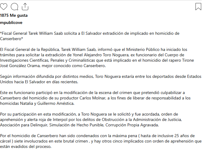 El Ministerio Público informó este viernes 21 de marzo que inició los trámites para solicitar la extradición de Yonel Alejandro Toro Noguera, uno de los 238 venezolanos deportados a El Salvador, quien es exfuncionario del Cuerpo de Investigaciones Científicas, Penales y Criminalísticas (Cicpc) y está implicado en la muerte del rapero Tirone José González Orama, mejor conocido como Canserbero.