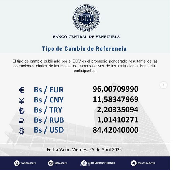 Datos del Banco Central de Venezuela (BCV) indican que el dólar oficial abrió la jornada en 84,42 bolívares y mantuvo ese valor hasta el cierre del día.