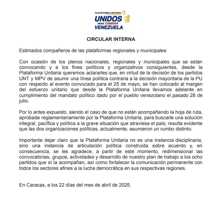 «En virtud de la decisión de mis partidos UNT y MPV de asumir una línea política contraria a la decisión mayoritaria de la PUD con respecto al evento del 25 de mayo, se han colocado al margen del esfuerzo unitario que desde la Plataforma Unitaria llevamos adelante en cumplimiento del mandato político dado por el pueblo venezolano el pasado 28 de julio».