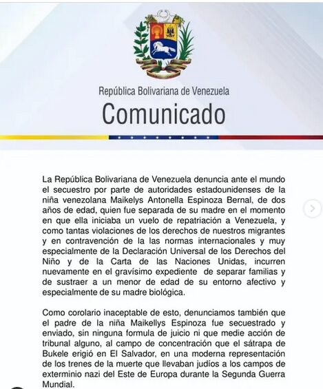 En un comunicado, difundido por el canciller de la República, Yván Gil, se afirmó que la pequeña debió ser separada en una clara acción de violencia extrema que es absolutamente inaceptable e impensable bien entrado el siglo XXI”.