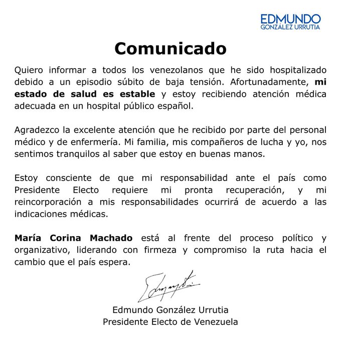 El líder opositor venezolano en el exilio, Edmundo González, fue internado este lunes en un hospital de Madrid, luego de presentar una bajada de tensión.