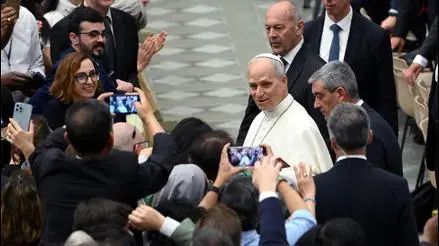 León XIV fue recibido a su entrada del aula Pablo VI con un fuerte aplauso por los periodistas y bromeó diciendo que esperaba que el aplauso también llegase al final de su discurso.