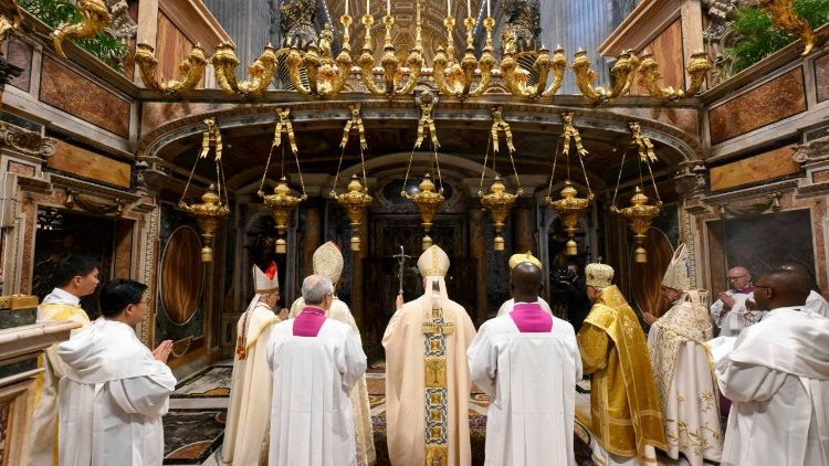 La solemne ceremonia comenzó dentro de la Basílica Vaticana, con una oración ante la tumba del Apóstol San Pedro, junto con los Patriarcas de las Iglesias Orientales. Desde allí, el Evangeliario, el Palio y el Anillo del Pescador fueron llevados en procesión hasta el altar en el atrio de la Plaza de San Pedro, mientras el coro entonaba la letanía de todos los santos.