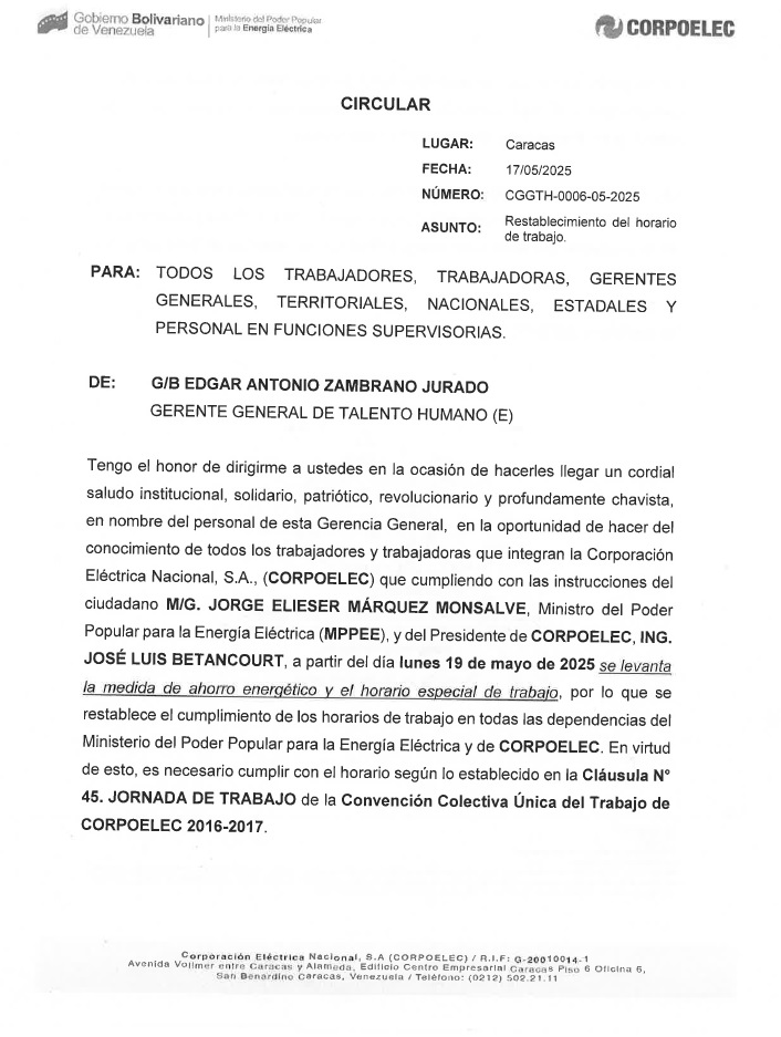 A partir de este 19 de mayo, «se restablece el cumplimiento de los horarios de trabajo en todas las dependencias del Ministerio del Poder Popular para la Energía Eléctrica y de Corpoelec. En virtud de esto, es necesario cumplir con el horario establecido».