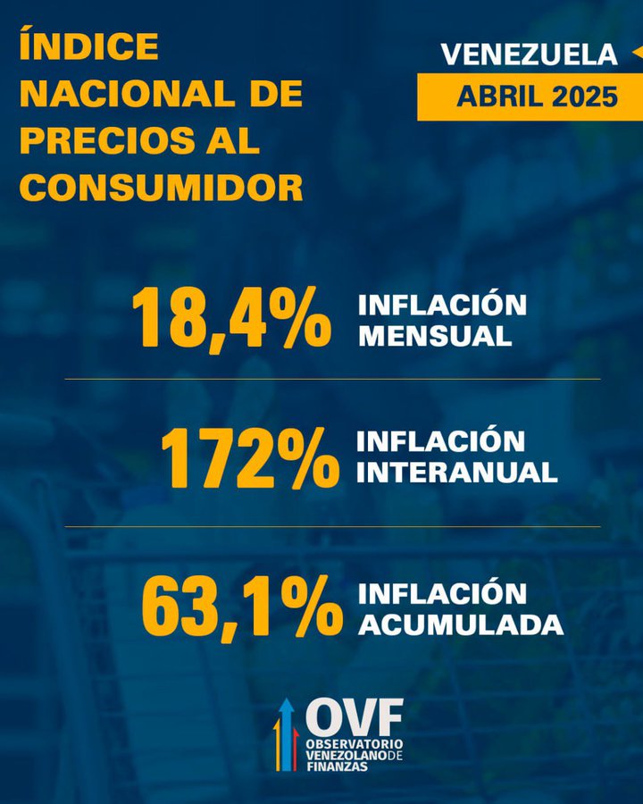 La inflación en Venezuela, según información del Observatorio Venezolano de Finanzas (OVF), para el mes de abril de 2025 se ubicó en 18,4%.