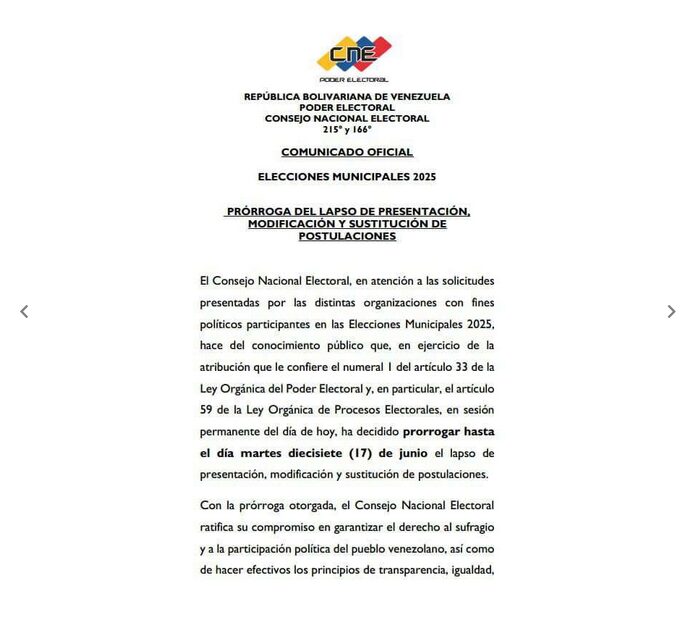 «El CNE ha decidido prorrogar hasta el martes 17 de junio el lapso de presentación, modificación y sustitución de postulaciones», detalló el organismo en el documento, reafirmando su compromiso con la flexibilidad y transparencia en el proceso comicial.