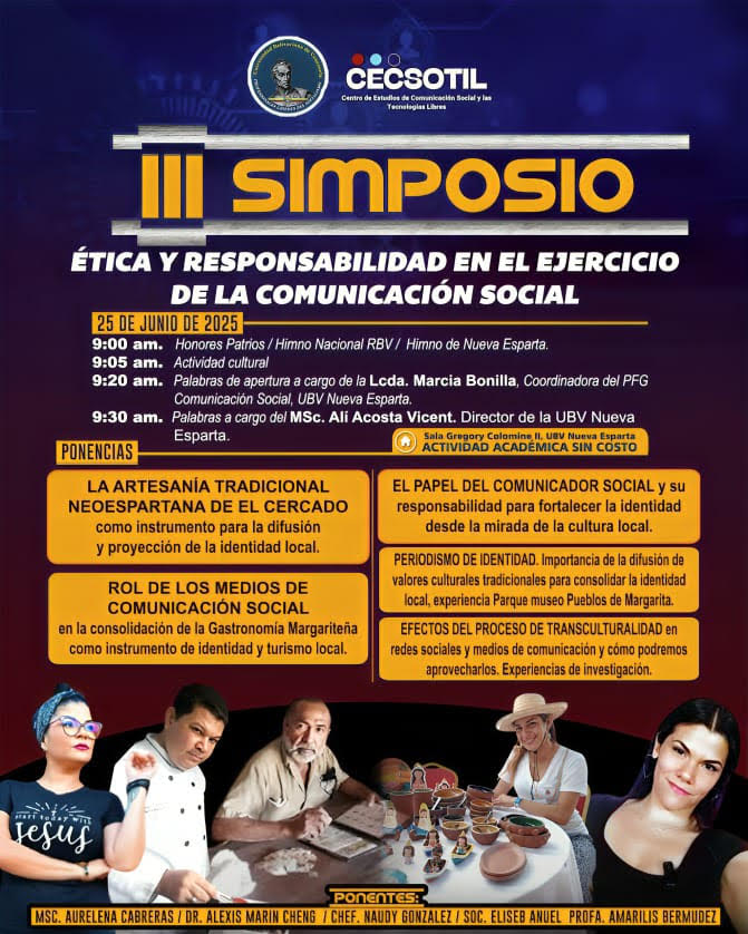 La Universidad Bolivariana de Venezuela sede Nueva Esparta, a través del Centro de Estudio para la Comunicación Social y las Tecnologías Libres, y el Programa de Formación de Grado en Comunicación Social en el marco de la celebración del Día Nacional del Periodista, realizará el III Simposio: Ética y Responsabilidad en el Ejercicio de la Comunicación Social