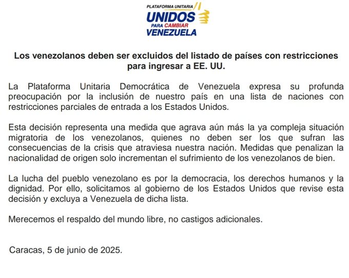 «Esta decisión representa una medida que agrava aún más la ya compleja situación migratoria de los venezolanos, quienes no deben ser los que sufran las consecuencias de la crisis que atraviesa nuestra nación», señaló la PUD en un comunicado publicado en X.