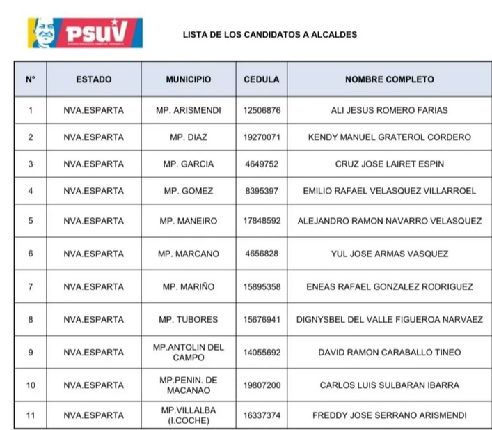 El Partido Socialista Unido de Venezuela (PSUV) ha dado a conocer los nombres de sus candidatos para las alcaldías del estado Nueva Esparta, de cara a las elecciones municipales que se celebrarán el 27 de julio.