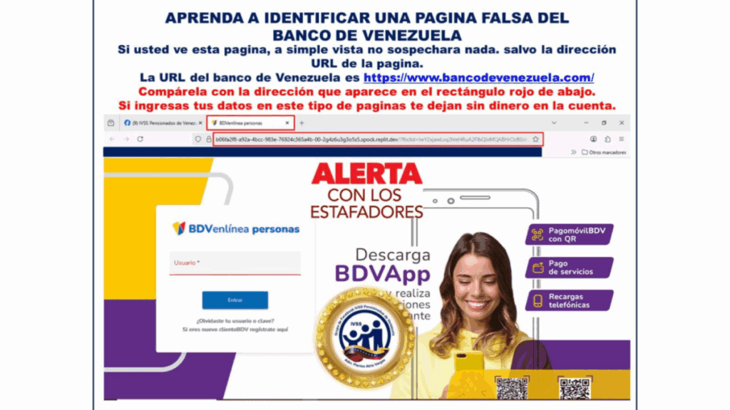 El canal de Telegram pensionados de Venezuela del Instituto Venezolano de los Seguros Sociales (IVSS) alertó sobre la creación de una página falsa del Banco de Venezuela, la cual opera para el robo de datos personales.