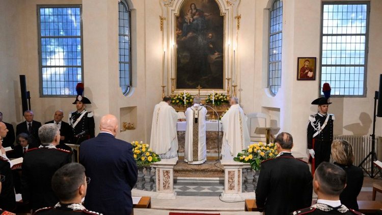 El Santo Padre preside la eucaristía en la capilla de la estación de los Carabineros en Castel Gandolfo y expresa su gratitud por la labor de esta fuerza italiana en la protección de los peregrinos que visitan Roma durante el Año Jubilar.
