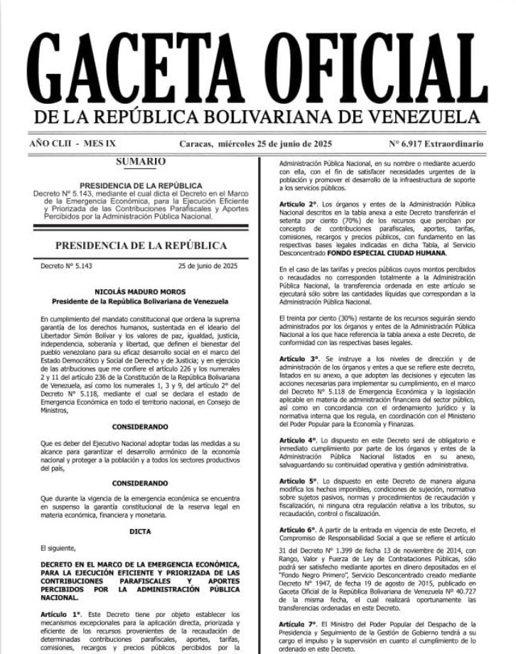 La decisión está establecida en el decreto publicado en la Gaceta Oficial Extraordinaria número 6.917 en su artículo 2 con fecha 25 de junio de 2025.