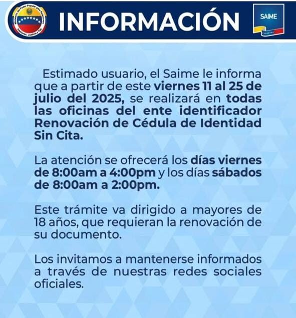 El Servicio Administrativo de Identificación, Migración y Extranjería (Saime), anunció que a partir de este viernes 11 hasta el 25 de julio se realizará la renovación de cédula de identidad sin previa cita.