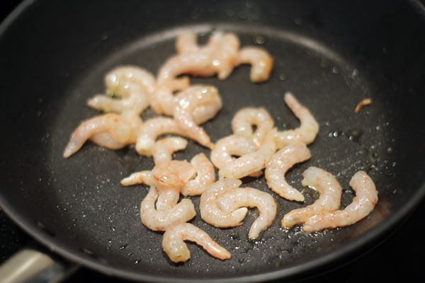 2.- Las gambas las pelamos y la pasamos por la plancha con una gotita de aceite. Una vez hechas retiramos y reservamos.