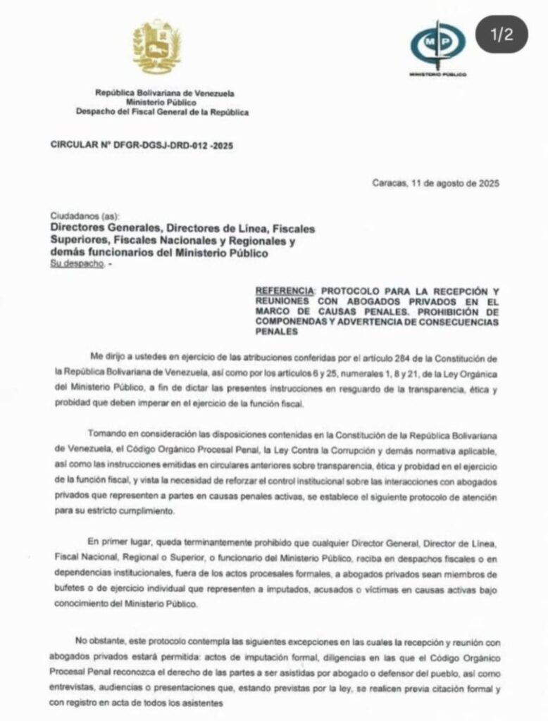 Según el documento oficial del 11 de agosto, queda prohibido recibir defensores en despachos fiscales fuera de actos procesales formales.