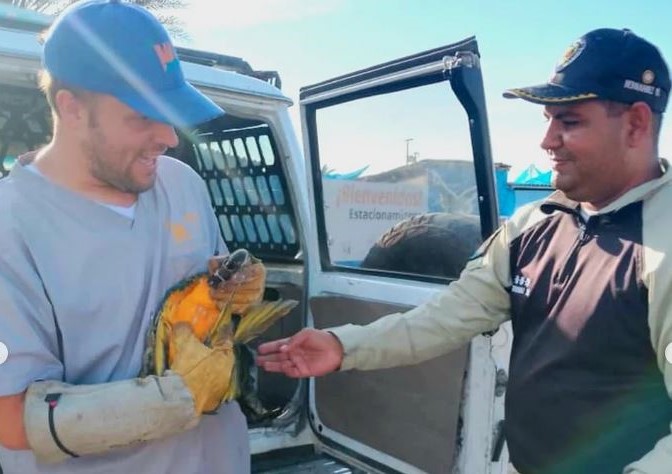 El Cnel. Abrahán Pérez Alvarado, Director General de POLIMARIÑO, junto a la sección vehicular y motorizada, hizo entrega del guacamayo azul a la organización @waterlandmundom, donde el ave recibió los cuidados necesarios y quedó bajo resguardo hasta su completa recuperación. Una vez restablecida, será liberada en su hábitat natural.