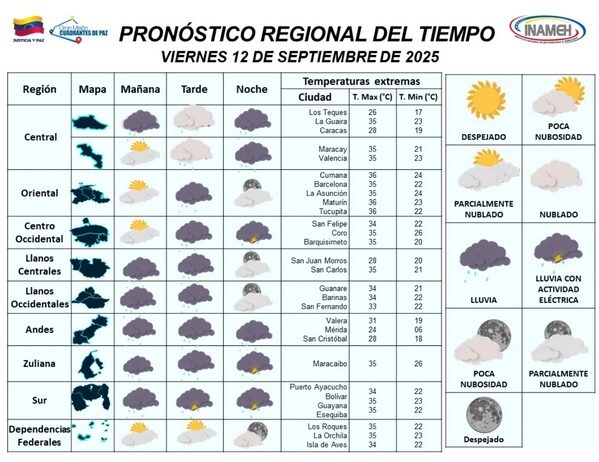 En Venezuela, el Instituto Nacional de Meteorología e Hidrología (Inameh) informó que se prevé para este 12 de septiembre cielo parcialmente nublado