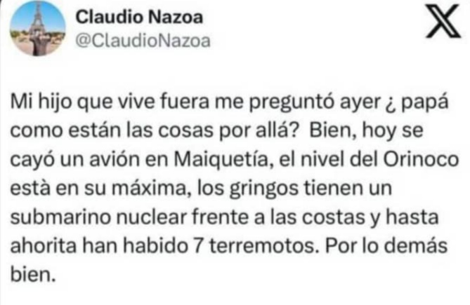 Si eres de los que despierta con un breve dolor de cabeza al abrir tus ojos, debes respirar profundo y oxigenarte. Me ha funcionado el esquema de inspirar en 6 segundos, aguantar la respiración durante otros 8 segundos y botar el aire por la boca en 10 segundos. El tiempo lo cuento mentalmente y repito este ejercicio durante cinco veces. Para los que les cuesta conciliar el sueño también funciona, yo lo hago debido a la práctica con un poco de más tiempo, pero para empezar resultará cómodo y evitará alguna hiperventilación que provoque mareo. Si se animan y quieren me cuentan la experiencia pero es indispensable entender que respirar a conciencia, obliga enfocarse en la respiración y dejar de pensar en todo el montón de cosas que nos abordan diariamente. Por allí leí un twitter de Claudio Nazoa que nos da una idea de cuántas cosas suceden y están en nuestra mente.
