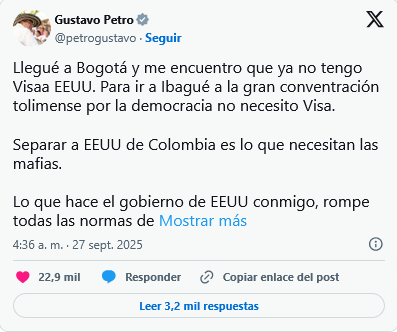 La decisión de Washington responde al tono “incendiario” que empleó Petro durante su discurso en Nueva York, donde exhortó a militares estadounidenses a desobedecer órdenes, un gesto calificado por el Departamento de Estado como “imprudente e incitador a la violencia”, según reseñó la Revista Semana,