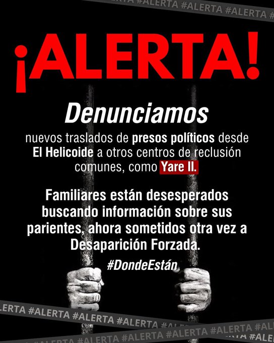 Vente Venezuela denunció nuevos traslados de presos políticos desde El Helicoide a otros centros de reclusión comunes, como Yare II, según informó en la red social X.