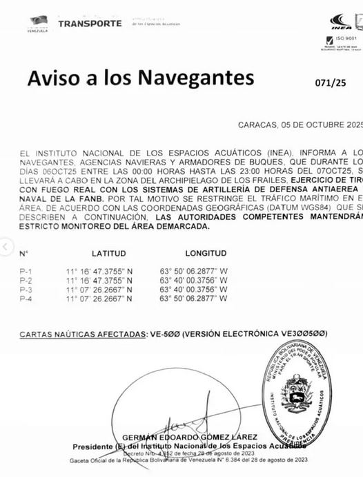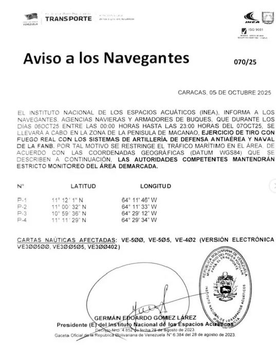 Durante los días 6 y 7 de octubre de 2025, la Península de Macanao será escenario de ejercicios militares con fuego real, según lo informado por el Instituto Nacional de los Espacios Acuáticos (INEA). Las maniobras, que se extenderán desde las 00:00 del día 6 hasta las 23:00 del día 7, incluirán el uso de sistemas de artillería antiaérea y naval por parte de la Fuerza Armada Nacional Bolivariana.