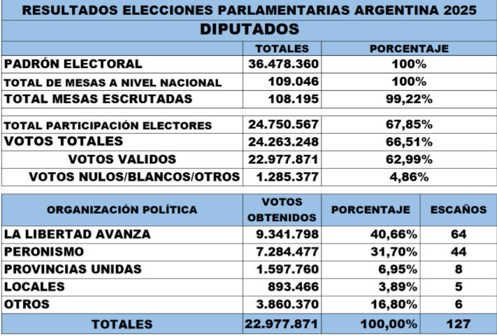 El pasado 26 de octubre se celebraron en Argentina las Elecciones Parlamentarias 2025 (conocidas como Elecciones Legislativas de medio término). Dichos comicios cambiaron radicalmente el mapa político del Congreso argentino. El partido del presidente Javier Milei, “La Libertad Avanza (LLA)”, no solo se consolidó, sino que obtuvo una victoria categórica, superando el 40% de los votos a nivel nacional. Este triunfo, de una magnitud inesperada, genera un nuevo y complejo escenario de gobernabilidad para los próximos dos años. En base a los resultados emitidos por el CNE, se observa que el partido de gobierno La Libertad Avanza (LLA) obtuvo el 40.66% de los votos pudiendo resumirse este triunfo, en una sola palabra: fortalecimiento.