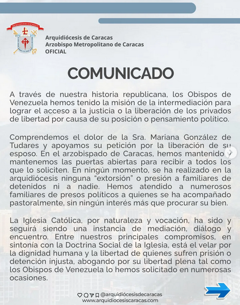 La aclaratoria surge tras las declaraciones de Mariana González, hija de Edmundo González Urrutia y esposa de Rafael Tudares detenido en el Rodeo, quien denunció presiones por parte de figuras vinculadas a la Iglesia y otros organismos.