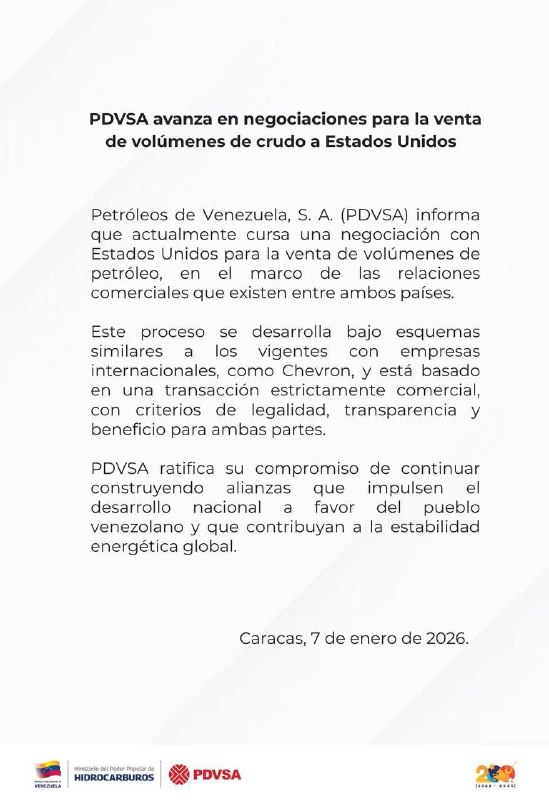 Petróleos de Venezuela, S.A. (PDVSA) anunció este miércoles que se encuentra en un proceso de negociación con Estados Unidos para la venta de volúmenes de petróleo. Esta iniciativa se enmarca en las relaciones comerciales existentes entre ambas naciones.