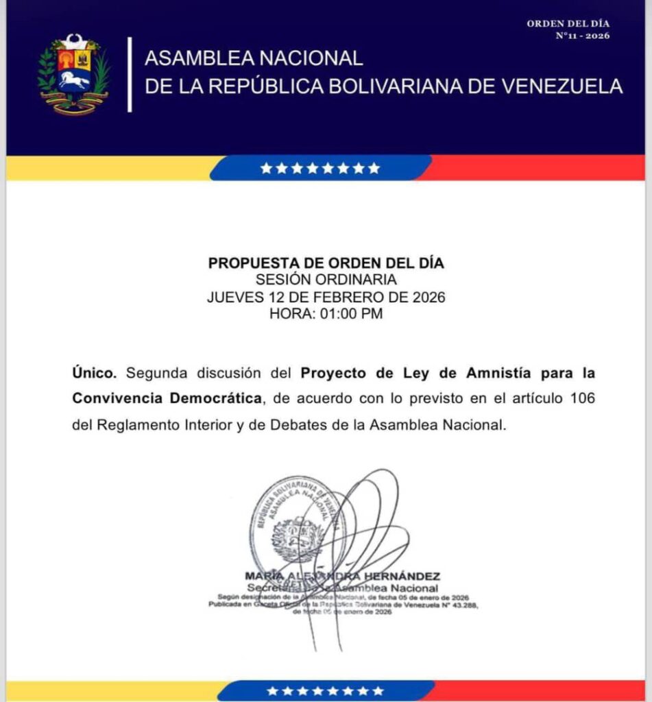 El Poder Legislativo convocó a una Sesión Ordinaria para este jueves 12 de febrero de 2026, con el objetivo de abordar la segunda discusión del Proyecto de Ley de Amnistía para la Convivencia Democrática.