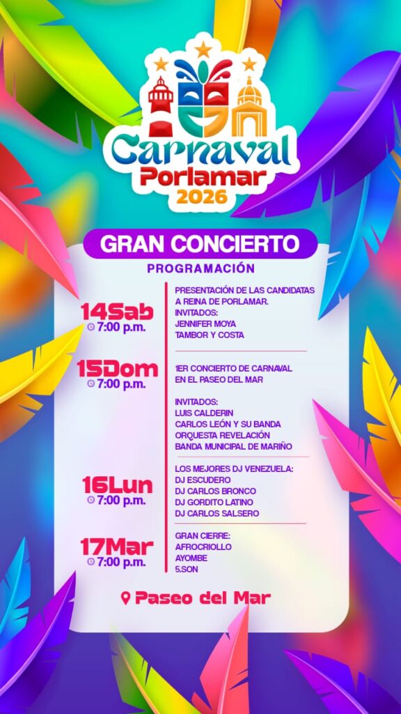 La Alcaldía del municipio G/J «Santiago Mariño» anuncia oficialmente la programación de los Carnavales Porlamar 2026, una agenda de cuatro días que promete transformar a la ciudad marinera en el epicentro cultural y turístico del Caribe venezolano.