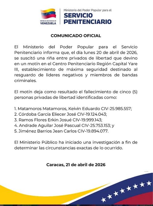 El Ministerio del Poder Popular para el Servicio Penitenciario confirmó este martes la muerte de cinco privados de libertad durante un motín ocurrido en el Centro Penitenciario Región Capital Yare III, ubicado en el estado Miranda.
