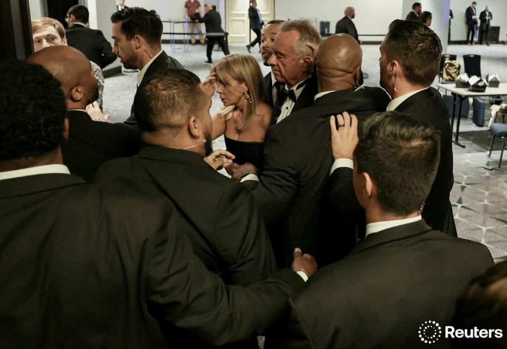 Los disparos se produjeron cuando la velada apenas comenzaba. Los asistentes comían una ensalada de arvejas y burrata, y los camareros se preparaban para servir el siguiente plato, cuando un equipo de seguridad irrumpió en el salón de baile y ordenó a todos tirarse al piso. Periodistas con trajes de gala y esmoquin se agacharon junto a las mesas mientras el vino salpicaba los manteles blancos. Alguien gritó “¡Apártese!”, otros pedían que se agacharan, y en un momento alguien en la sala exclamó “¡EE.UU.!”. Testigos reportaron haber escuchado entre cinco y ocho disparos.