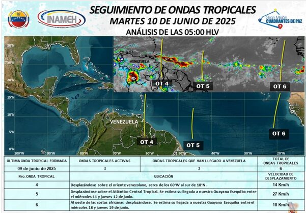 El Instituto Nacional de Meteorología e Hidrología alertó sobre el pronóstico de lluvias para las próximas horas en Venezuela Para este martes 10 de junio, el pronóstico del Instituto Nacional de Meteorología e Hidrología (Inameh) advirtió que la onda tropical N.° 4 se desplaza de oriente al centro de Venezuela. Por otra parte, la presencia de polvo sahariano y subsidencia del […]